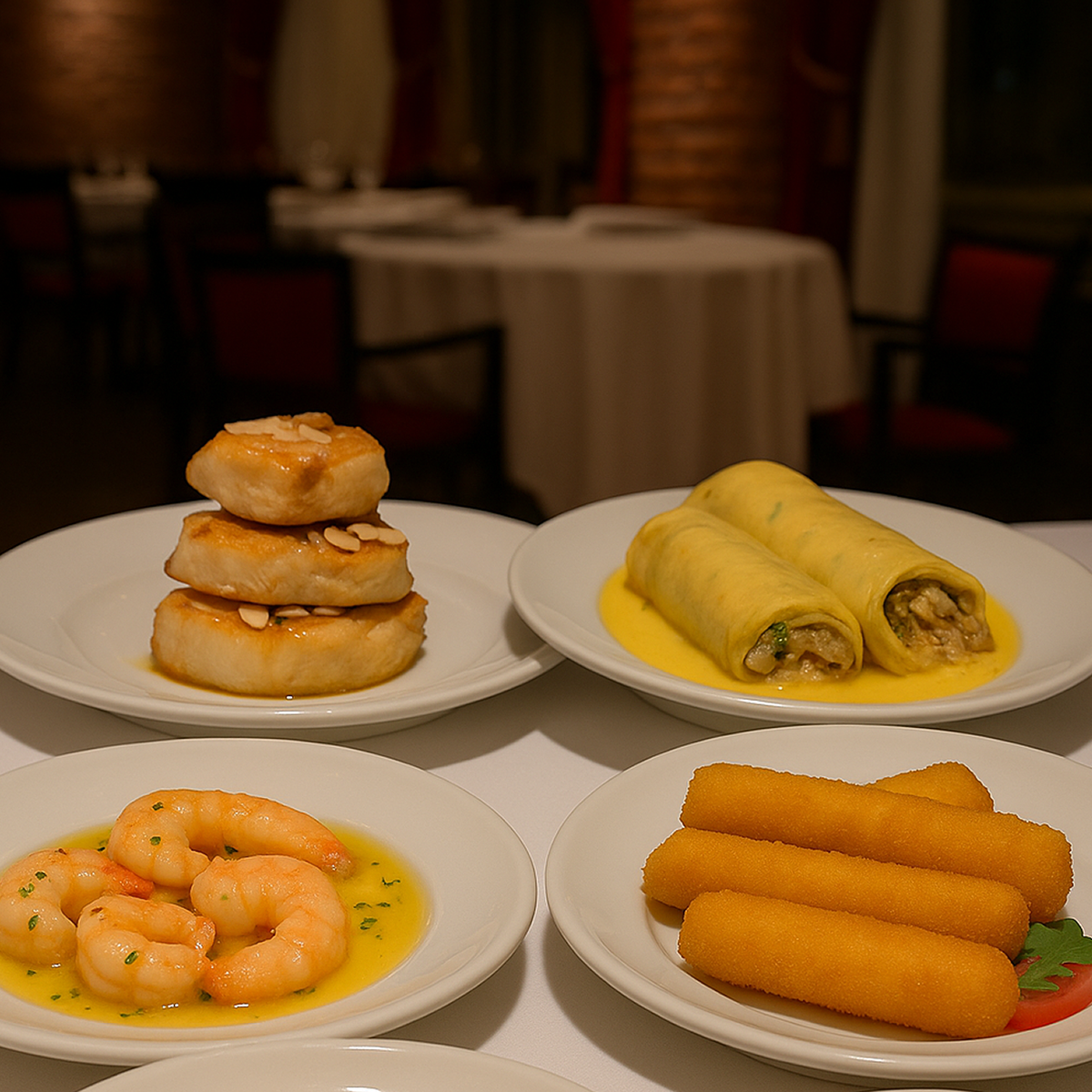 Creppes rellenos de ave y espinaca en fondo de azafrán.